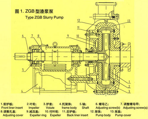 ZGB系列渣漿泵為雙泵殼結(jié)構(gòu),即泵體、泵蓋帶有可更換的耐磨金屬內(nèi)襯(包括葉輪、護(hù)套、護(hù)板等)。泵體、泵蓋根據(jù)工作壓力采用灰鑄鐵或墨鑄鐵鑄造。該系列泵均為垂直中開式,泵體有止口與托架用螺栓聯(lián)接。泵的吐出口方向可按45度間隔八個角度旋轉(zhuǎn)安裝。葉輪前后蓋板設(shè)有背葉片以減少泄漏及提高泵的使用壽命。該系列泵進(jìn)口為水平方向,從傳動方向看泵為順時針方向旋轉(zhuǎn)。起動及使用時嚴(yán)禁電機反方向旋轉(zhuǎn),否則,將葉輪脫落造成事故。