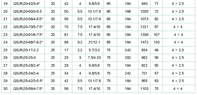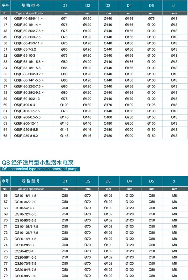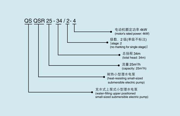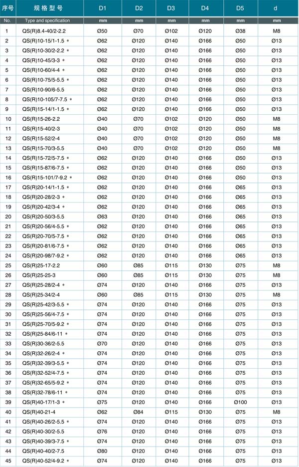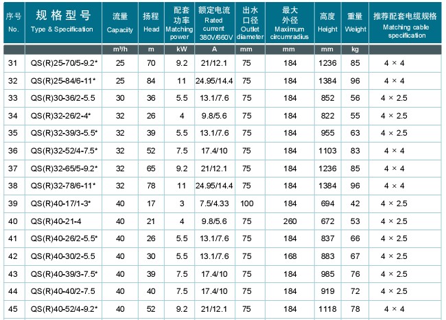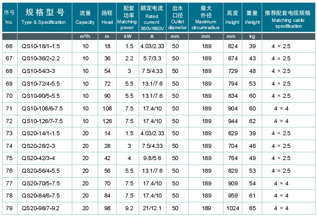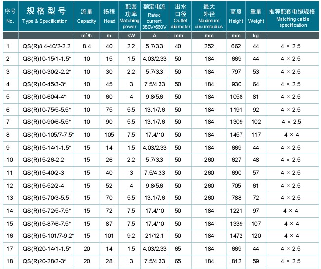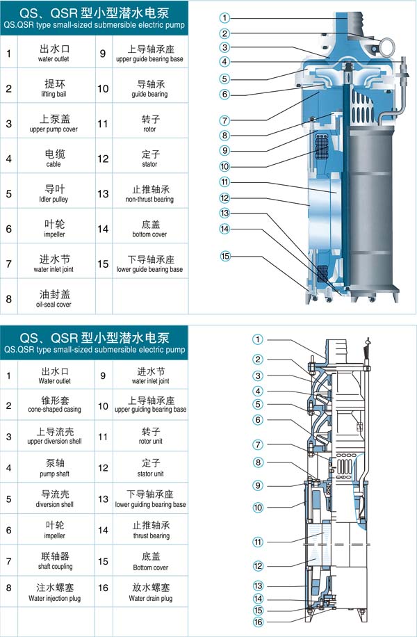 QS型潛水電泵、潛水電機兩大部分組成。電機內腔采用充水式定子繞組采用聚乙烯絕緣尼龍?zhí)啄退姶啪€,保證電機在水介質中正常工作,定轉子表面涂特殊的耐水涂料,轉子軸伸端有甩砂器,有效的阻止泥沙與水浸入電機腔內,軸承室填充耐水潤滑脂,并用骨架油封保護,有效地防止液體進入軸承室損壞軸承,電機腔內充入清潔的水,起到電機冷卻作用。