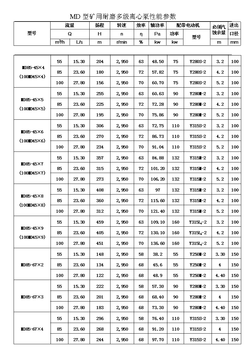 注:D(DF多級耐腐蝕離心泵、DY多級離心油泵、MD多級耐磨離心泵)80-30為習慣表示方法,其中80表示泵吸入口直徑為80mm,30表示泵設計點單級揚程為30m,其它含義與上述表示方法相同。
