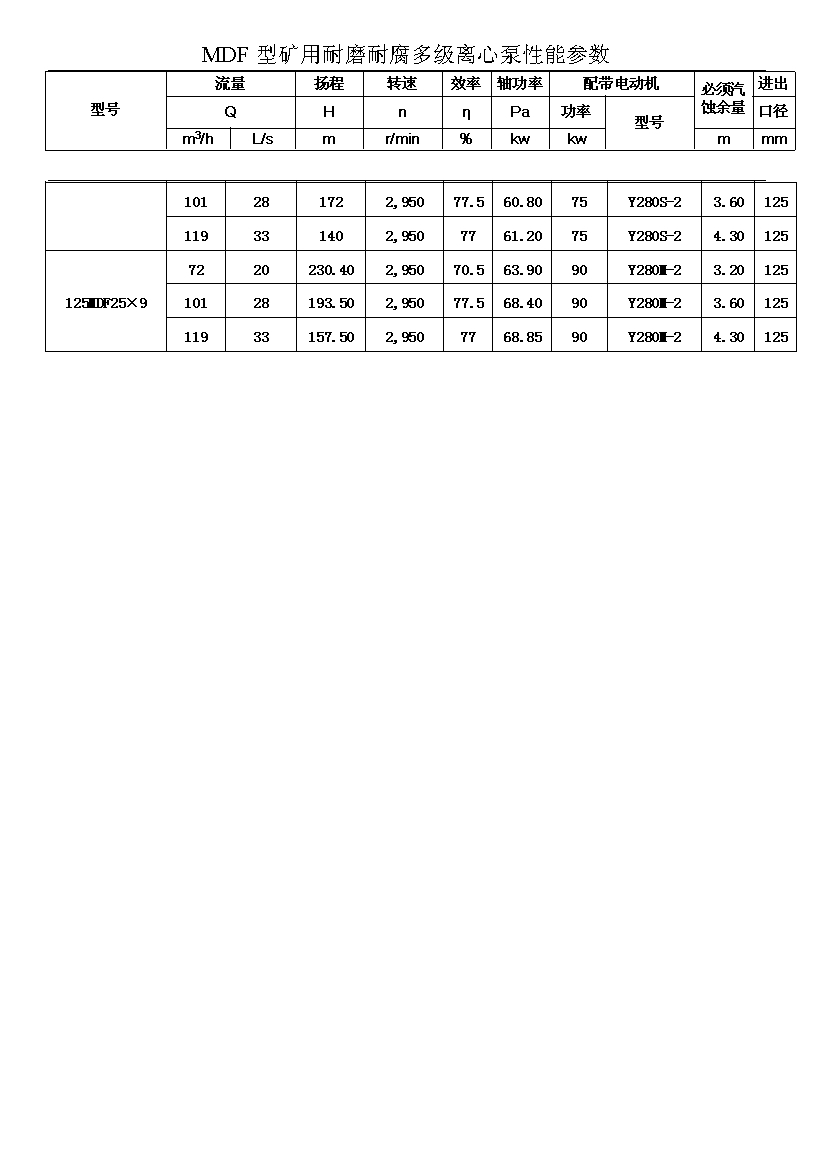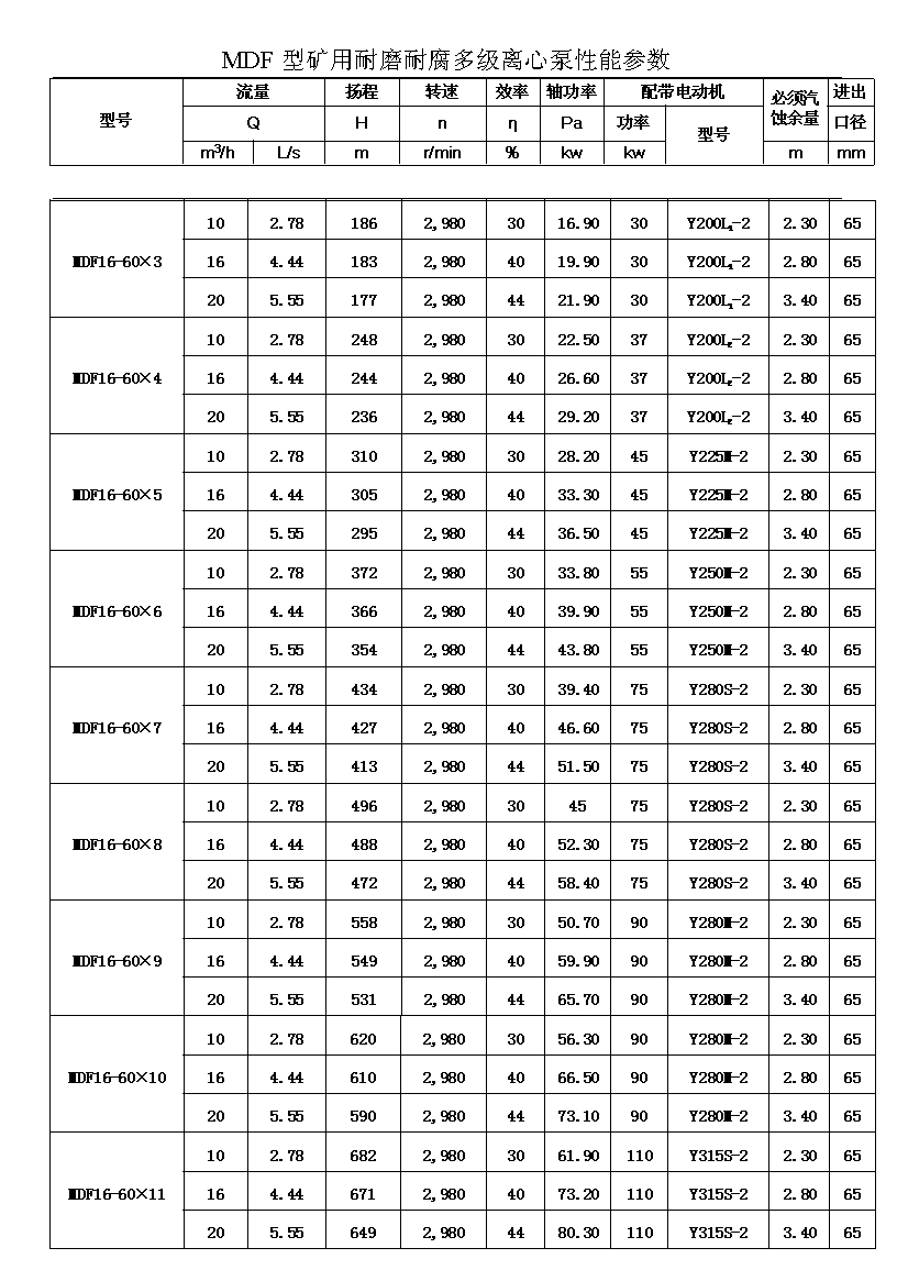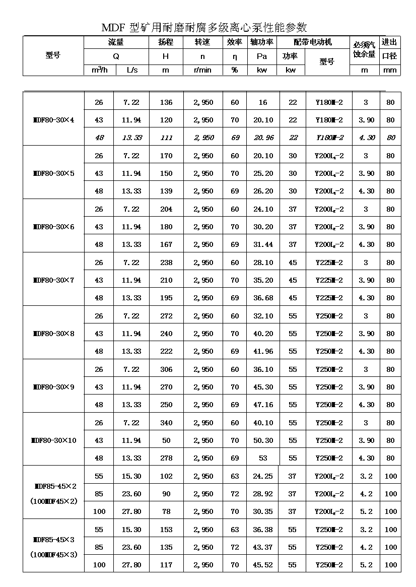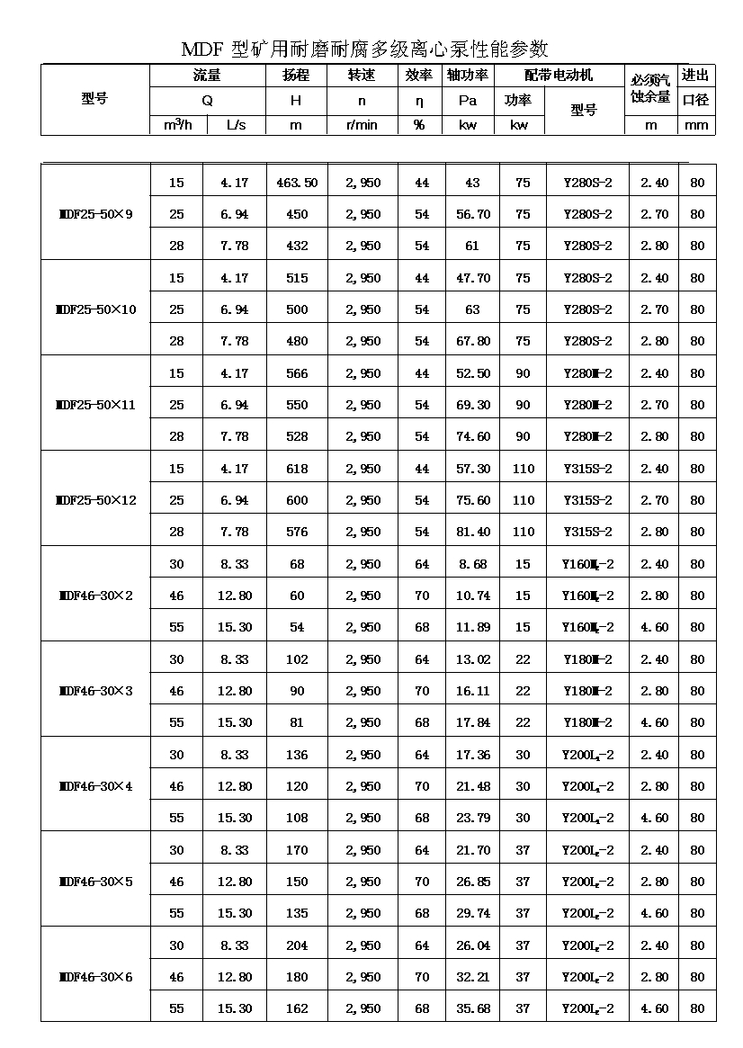 MDF型泵均系單吸、多級節段式離心泵,適合輸送含有一定雜質量(含雜質量小于1.5%,顆粒度小于0.5毫米)、含有一定的腐蝕性(PH=6-9)的水 或類似的其他液體,該系列泵具有優良的耐磨性、耐腐蝕性和汽蝕性,以及使用壽命長等優點,輸送介質溫度不大于80℃,適用于煤礦、非煤礦山、工廠、城市等 場合的供排水。